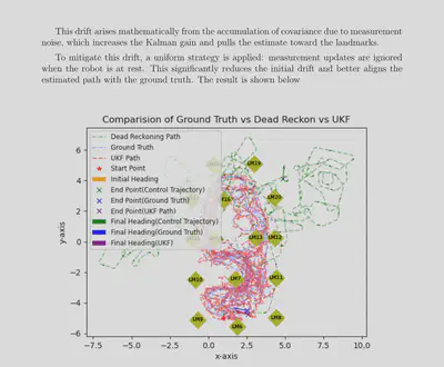 This project implements an Unscented Kalman Filter (UKF) for state estimation of a mobile robot operating in a 2D plane. The robot’s state is represented as $(x, y, \theta)$ and is estimated by fusing odometry control commands with range-bearing measurements to known landmarks. The implementation is tested on the MRCLAM (Multi-Robot Cooperative Localization and Mapping) dataset from the University of Toronto’s Autonomous Space Robotics Lab.
